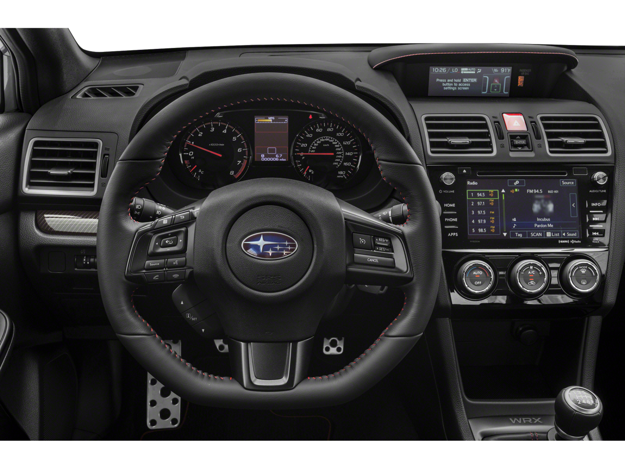 This car is well equipped with the following features: Popular Package #1 (Alloy Wheel Locks, Auto-Dimming Mirror w/Compass & HomeLink, Cargo Tray, Center Armrest Extension - Black, Hardware Bag 3-Pin, and Rear Bumper Applique), Standard Model (6MT), WRX Short Throw Shifter Package (STI Shift Knob and STI Short Throw Shifter (WRX)), 4-Wheel Disc Brakes, 6 Speakers, ABS brakes, Air Conditioning, Alloy wheels, AM/FM radio: SiriusXM, Automatic temperature control, Brake assist, Bumpers: body-color, CD player, Delay-off headlights, Driver door bin, Driver vanity mirror, Dual front impact airbags, Dual front side impact airbags, Electronic Stability Control, Emergency communication system: STARLINK Safety and Security (Subscription Required), Exterior Parking Camera Rear, Four wheel independent suspension, Front anti-roll bar, Front Bucket Seats, Front Center Armrest, Front fog lights, Front reading lights, Fully automatic headlights, Heated door mirrors, Heated front seats, Illuminated entry, Knee airbag, Leather Shift Knob, Leather steering wheel, Leather-Trimmed Upholstery, Low tire pressure warning, Occupant sensing airbag, Outside temperature display, Overhead airbag, Overhead console, Panic alarm, Passenger door bin, Passenger vanity mirror, Performance Design Heated Front Bucket Seats, Power door mirrors, Power driver seat, Power moonroof, Power steering, Power windows, Radio data system, Radio: Subaru STARLINK 7.0 Multimedia Plus System, Rear anti-roll bar, Rear seat center armrest, Rear window defroster, Remote keyless entry, Security system, Speed control, Speed-sensing steering, Split folding rear seat, Spoiler, Sport steering wheel, STARLINK/Apple CarPlay/Android Auto, Steering wheel mounted audio controls, Tachometer, Telescoping steering wheel, Tilt steering wheel, Traction control, Trip computer, Variably intermittent wipers, and Wheels: 18 x 8.5 High Luster Finish Alum Alloy.